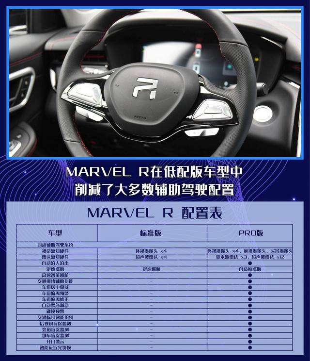 当然,除了舒适性配置,同身为电动车,肯定少不了辅助驾驶配置。MARVEL R在这方面的表现不如其他方面表现亮眼。虽然有驾驶模式切换和自动驻车这类辅助功能,但售价21.98万的标准版车型中,不仅没有前驻车雷达和自动泊车,就连自适应巡航都被减配成了定速巡航。