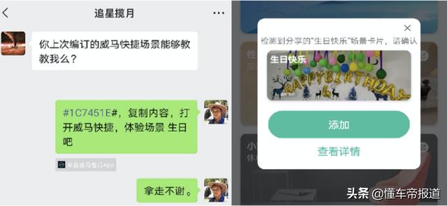 此外,基于SOA架构研发的威马场景码也通过本次OTA上线,使用威马场景码,用户可一键分享自定义编程场景卡片至微信好友及朋友圈,好友可一键添加场景。