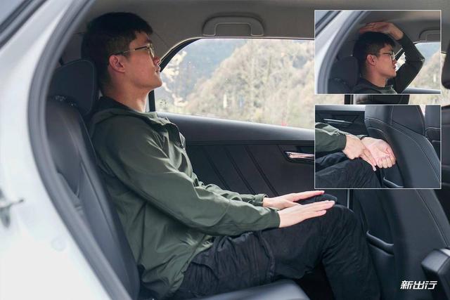 乘坐空间方面,身高 178cm 的我将前排座椅调整至前后合适的位置后,此时我的头部空间还有 1 掌左右;保持前排座椅不动的情况下去到后排,此时后排腿部空间还有 1 拳头 2 指,头部空间还有 1 掌。