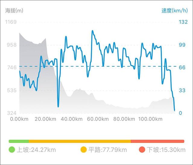 行驶 119.3km 掉 118km 而且还是 SPORT 模式、暖风以及满载的情况下,1:1 的掉电量成绩我还是很惊喜的,并且在我打开行者 APP 发现全程有 24km 左右的上坡、77km 左右的平路和 15km 的下坡,所以这样的成绩也并是下坡跑出来的。
