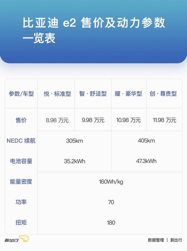比亚迪 e2 共推出 3 个版本,补贴后售价 8.98 万元-11.98 万元。此外官网上显示 e2 还有一个出行版,售价为 11.98 万元;