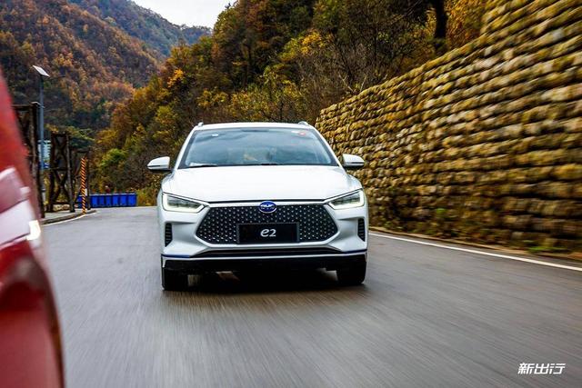 e2 作为一台偏向家用的车在这样的山路中还是比较吃亏的。但如果偶尔带着全家去走这样的山路也是绰绰有余,因为在上山的途中,我们驾驶的 e2 在满载 4 名成年人的情况下,全程采用 ECO 模式便可以轻松应对这样的 U 型弯加上连续的爬坡。得益于纯电动车型的先天优势 e2 在爬坡时动力输出快速且流畅,并不会有迟滞的动力输出延迟的状况发生。