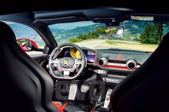 法拉利说的到底是不是真相?我有一个直接的疑问:812 Superfast是否只是在技术表面上上了一个台阶而非在性能方面全面进步?因为兰博基尼Aventador S的故事告诉我们它只是自顾自地变得更快,但是即便是几圈赛道都能让你摸着疼痛无比的后背和胯部下车休息。我们随后再揭晓答案,暂时就把812 Superfast当做是法拉利又一顶尖产品。长长的机盖下,满是铝制杆件,前轴的后方坐落着法拉利那台代号为F140的V12发动机。虽然基础机型与F12berlinetta的完全相同,812 Superfast发动机上75%的零件均为全新设计,汽缸缸径保持不变,但冲程从75.2mm增加到了78mm,因此排量也从6262mL增加至6496mL。新发动机的压缩比从13.5:1提升至13.64:1,再包括一些林林总总的控制系统以及进气系统的升级,812 Superfast发动机的功率从552kW增加为596kW。最大扭矩达到了718Nm,红线转速也提高至8900rpm。