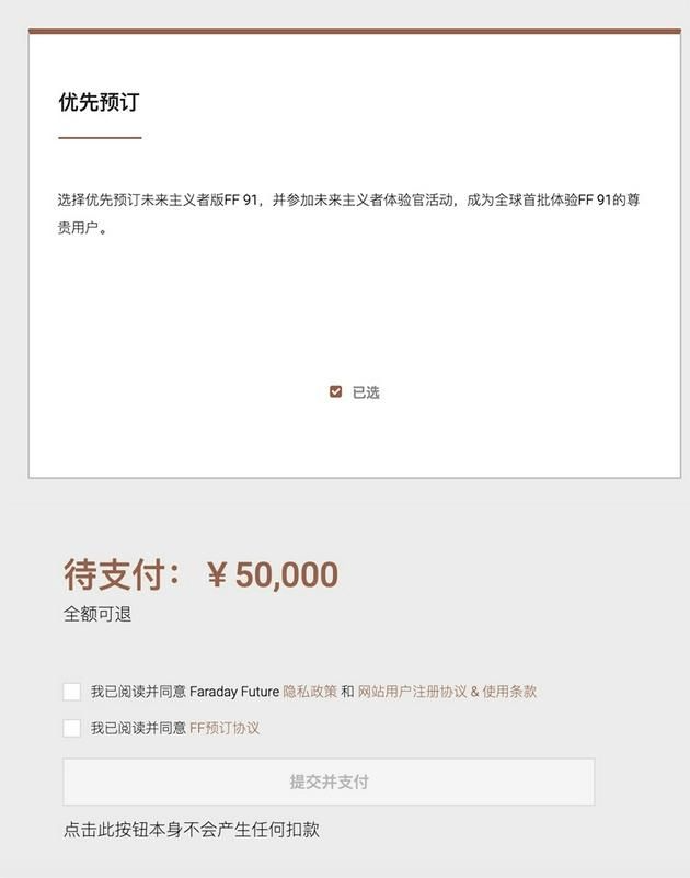 据官网信息,用户需要支付5万元来作为优先预订的预定金来提前体验未来主义者版FF91,5万元预订金支持全额可退。据悉,这款FF91会在9月21日洛杉矶总部举办投资者日上正式亮相,并于2022年上半年上市。