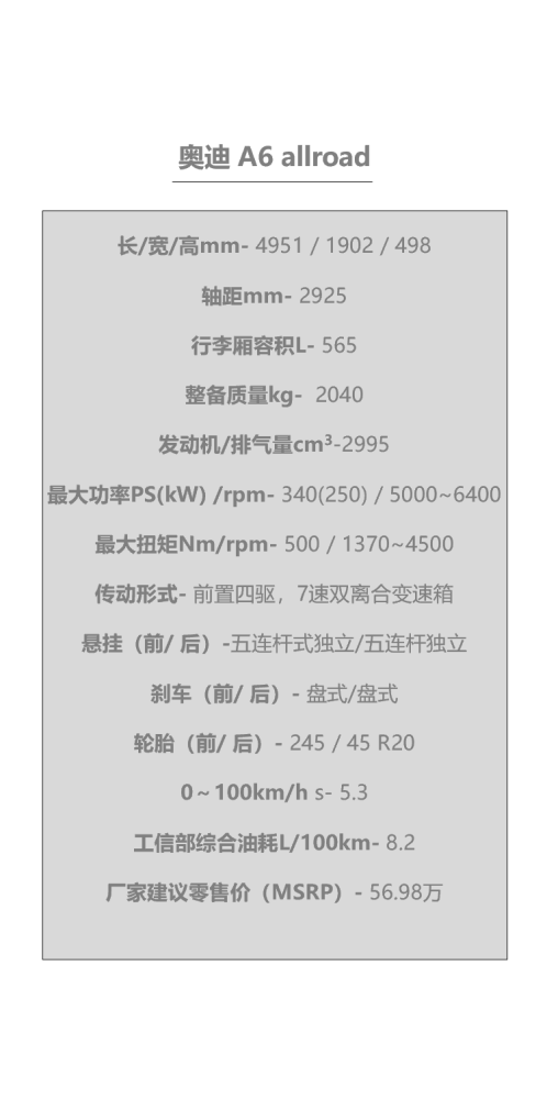 就如文章开头所提到的,对于新时代消费者而言,选择A6 Allroad无非就是想从一开始的设计就能彰显出其人格特立独行一面,因此再结合独具产品力的Allroad标签来看,全新A6 Allroad还能够赋予出是更具质感的驾乘体验,和丝毫不显弱势的实用价值,能文能武,何乐而不为呢?