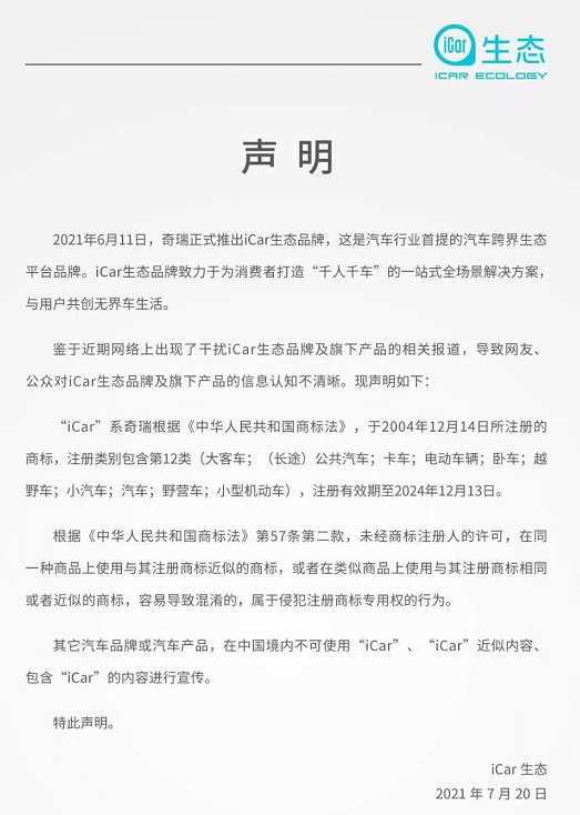 最后再讲一件有趣的事情,按照苹果一贯的命名规则,有许多人猜测苹果汽车或为iCar,但这个名字的商标已经被中国公司注册过了,而持有iCar商标的公司正是奇瑞汽车。因此在近日,奇瑞官方发布公告强调称:其它汽车品牌或汽车产品,在中国境内不可使用“iCar”、“iCar”近似内容、包含“iCar”的内容进行宣传。