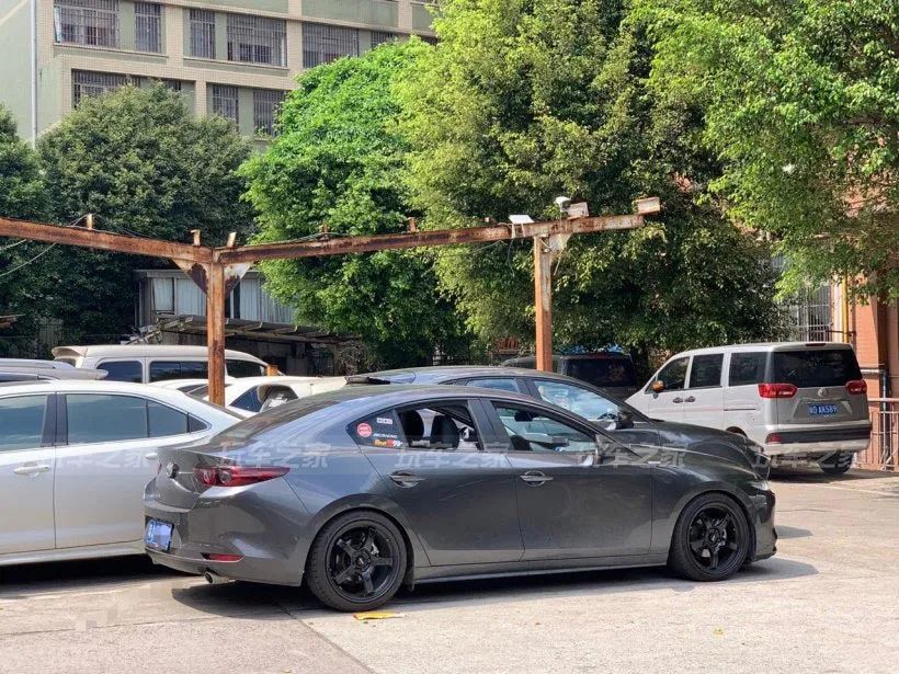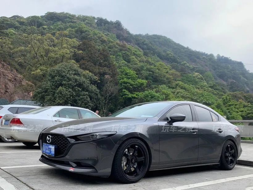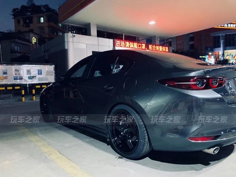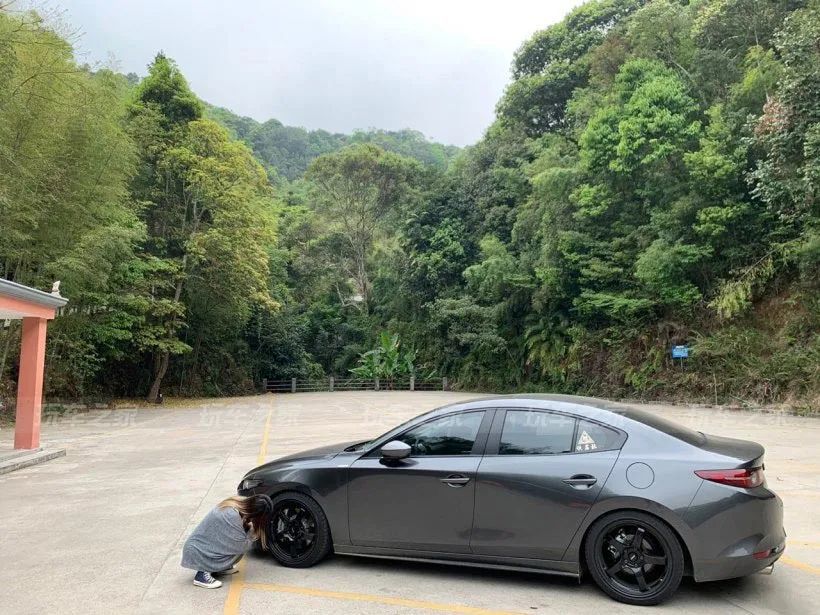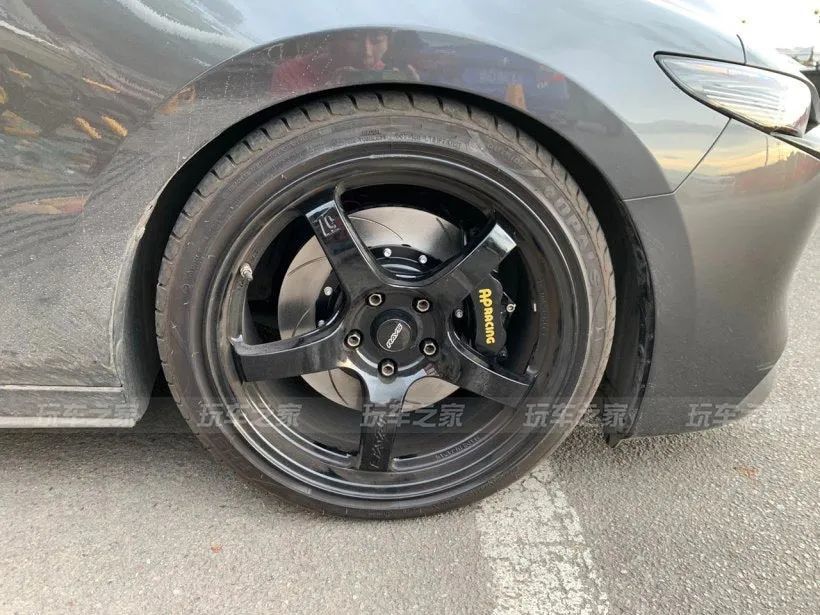 “轮毂是RAYS 57CR,主要便宜又好看。目前的数据是18寸8.5j ET38,配225/40/18的轮胎,之前买轮毂的时候自己懒没量数据,全靠自己瞎算,其实完美数据应该是前8j后8.5j,这样就刚好齐边饱满了,前轮现在有点凸了,用的是225/40发现包不住轮毂,时不时轮毂跟轮胎那条缝隙太大还卡石子,都刮花了。”