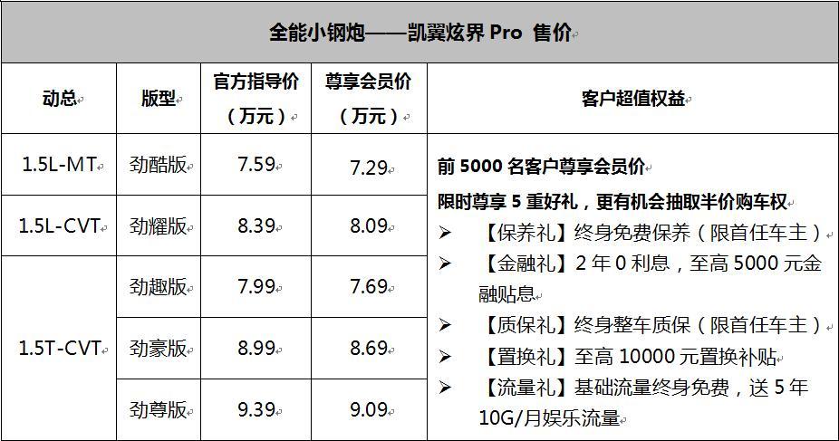 昨晚,全面进化的“全能小钢炮”凯翼炫界Pro在宜宾正式上市,新车推出1.5T+CVT、1.5L+CVT、1.5L+5MT三种动力总成共5款配置车型,指导价区间7.59—9.39万元。并且前5000名购车的用户,还可在指导价基础上再享3000元优惠,即尊享会员价7.29—9.09万元购车。此外,凯翼汽车还为8月28日前购买炫界Pro的用户提供了5重大礼,可谓将实惠进行到底。那么这款新车本身又有何看点呢?请往下看。