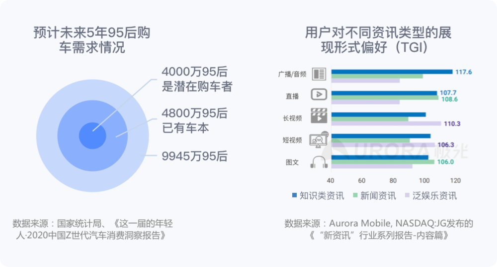 根据Aurora Mobile, NASDAQ:JG 发布的《“新资讯”行业系列报告-内容篇》中显示,年轻用户更偏向于泛娱乐的内容,而且更喜欢直播、短视频这样的形式来获取信息。对于喜欢知识类内容的用户,则更偏向图文、直播、视频的形式。那么,对于汽车之家而言,我们该以何种形式、何种角度来发力内容,从而抓住用户已经变化的偏好是我们要考虑的问题。