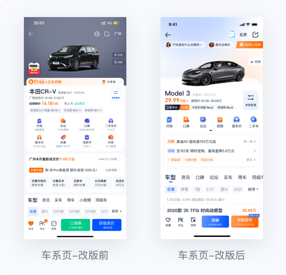 以车系页为例,承担着以看车为中心向其他场景分发的任务。从用户角度来讲,过大的信息量和繁杂的信息呈现类型,导致用户对于车系页的认知负担加重,用户总是吐槽说找不到自己想要的内容,所以保证信息量最大化的同时降低用户的认知负担,就需要减少信息呈现类型。于是简化现有的结构进行纵向重构,分类组合相同属性的内容和服务。