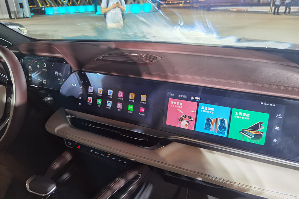 中控屏和副驾专属屏的尺寸均为12.3英寸,内部首发搭载了吉利银河OS系统,采用高通骁龙8155芯片,反应十分迅速,没有出现卡顿的现象。系统内部还搭载了B站、爱奇艺、抖音等当下主流的应用,值得一提的是,用户只需通过方向盘就可以切换抖音,十分便捷。