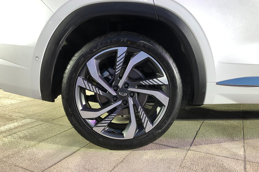 实拍车的轮毂采用5辐设计,尺寸达到了20英寸,为侧面增添了不少豪华气息。与之匹配的轮胎来自固特异EAGLE F1 ASYMMETRIC 3 SUV,主打运动操控。