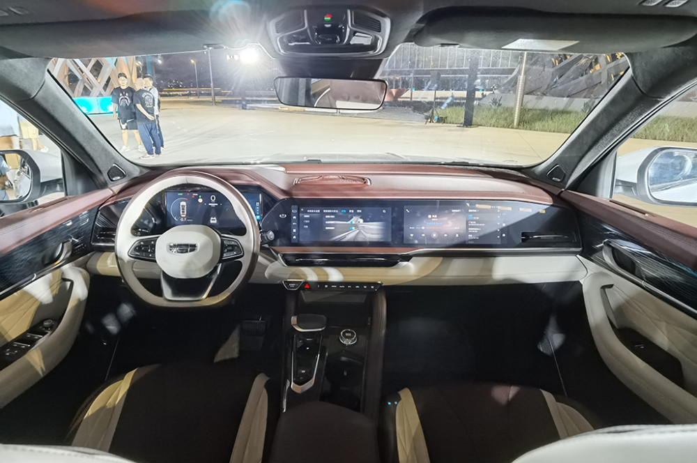 星越L的内饰采用了极其简约的设计风格,除了方向盘和少数实体按键,中控台被尺寸巨大的三联屏所覆盖,简约且富有科技感,这在同级中十分少见。