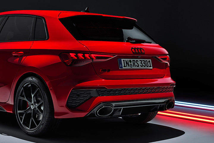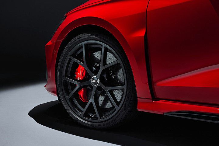 而在侧面造型上,全新奥迪RS3不仅采用了宽体包围,在翼子板后方还设计了通风口以带来更好的散热效果以及运动氛围。此外新车也提供了包括5辐Y型RS轮圈在内的多种熏黑样式的大尺寸轮圈供用户选择,配合醒目的刹车卡钳,效果相当出色。