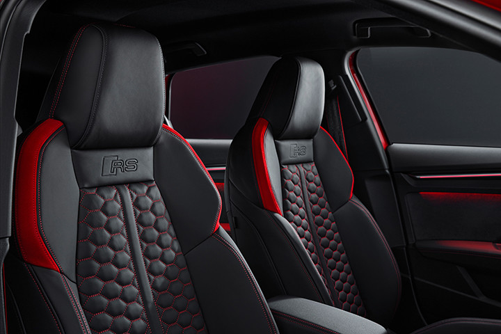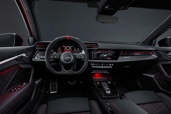 这一代奥迪A3所采用的内饰布局在运动感以及科技感均有不错的表现,上置的六边形空调出风口更是被网友称为“兰博基尼同款”设计。而在这台全新奥迪RS3上更是将竞技感发挥到极致,配备了带有压花纹路的RS运动座椅,RS方向盘采用了Alcantara材质进行包裹,在空调出风口也加入了亮色饰条营造出更强的座舱氛围。
