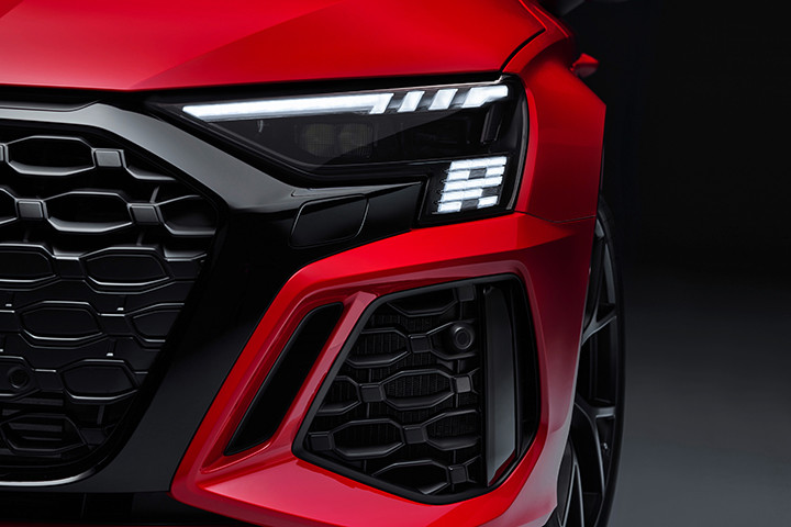新车前大灯组保持着普通版A3的设计样式,不过在日间行车灯的设计上玩出新花样,灯组下方配备了一块3x5 LED灯组面板,能够显示出“RS 3”及赛车格子旗的样式,“灯厂”出品从未让我们失望过,这或许也会成为未来奥迪产品的一个风向标。