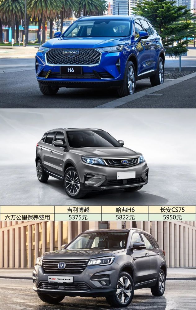 按照各自厂家的保养周期计算,吉利博越是唯一比皓影低的自主品牌,每7500公里保养一次,6万公里花费5375元(含工时费用);哈弗H6为5822元(含工时费用);至于长安CS75是唯一一辆5000公里保养的车型,但是费用也跟H6不分上下,6万公里保养花费5950元(含工时费用)。