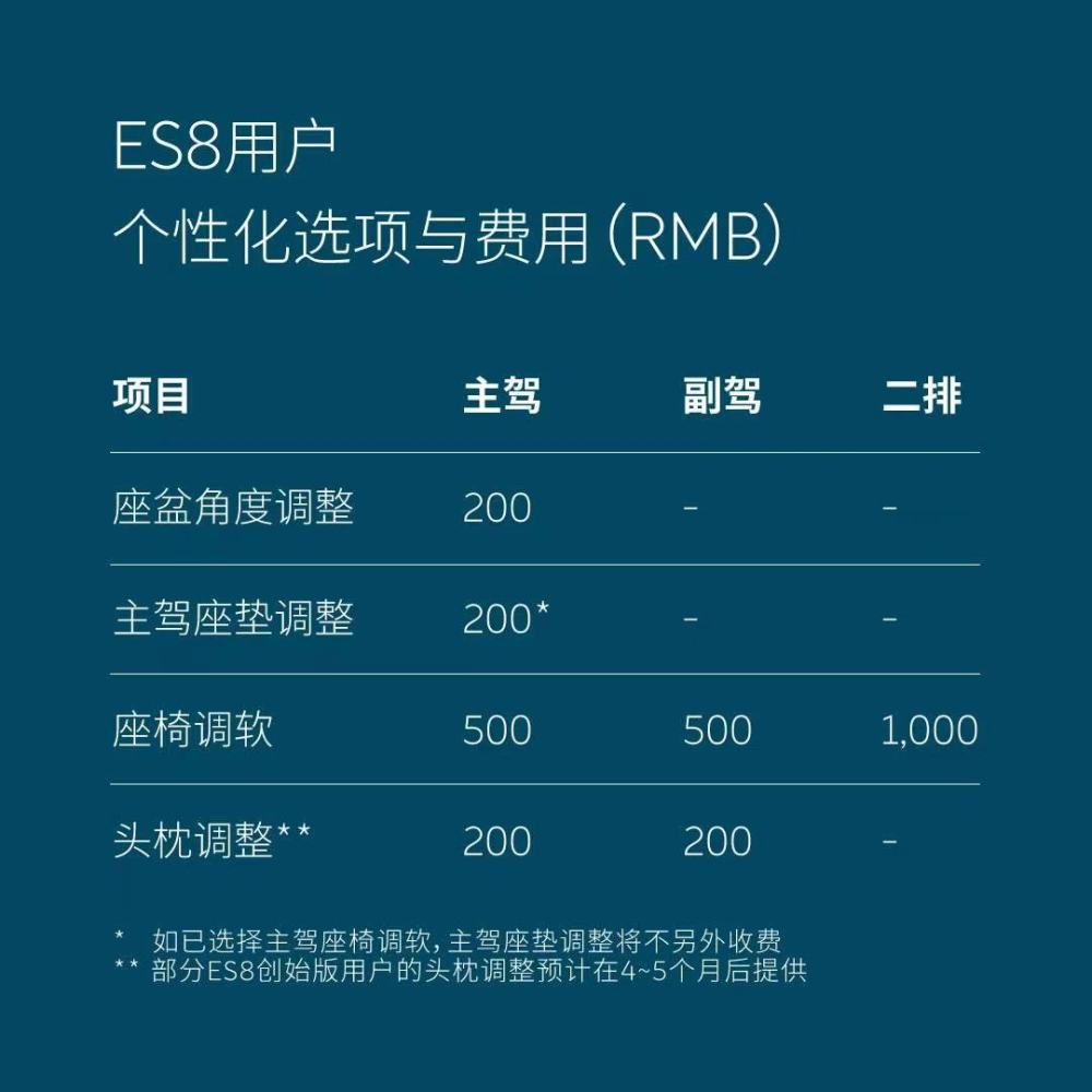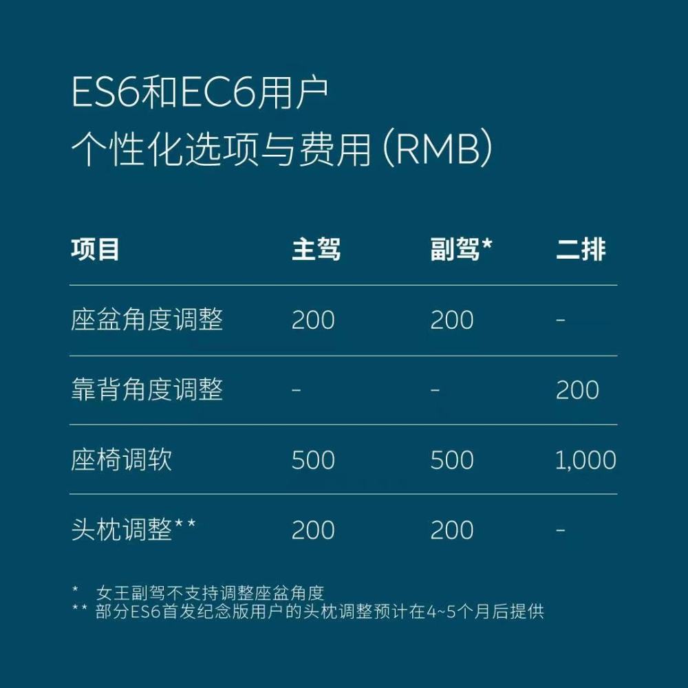 7月21日,蔚来汽车正式发布座椅舒适体验个性化方案,针对ES8用户和ES6和EC6用户分别提供四种可选的调整方案,单个项目的收费价格在200元-1000元不等。
