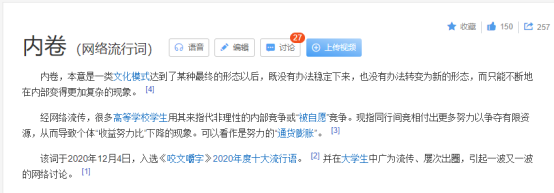 百度百科是这么说的“现指同行间竞相付出更多努力以争夺有限资源,从而导致个体“收益努力比”下降的现象。可以看作是努力的“通货膨胀”。