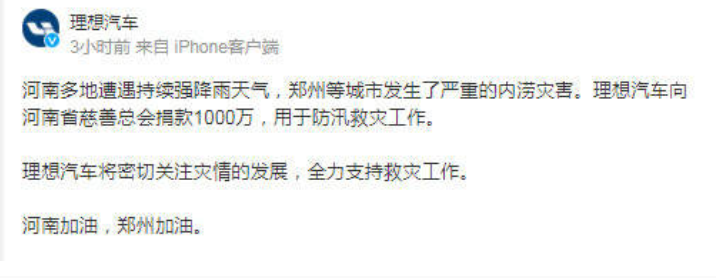 理想汽车发文表示因河南多地遭遇持续性强降雨天气,造成郑州等多地发生严重内涝灾害,理想汽车向河南省慈善总会捐款100万元,用于防汛救灾工作。而且理想汽车也会继续密切关注灾情的发展,全力支持救灾的工作。虽说理想汽车最近也有一些棘手的问题要处理,因为座椅出现水银的事件,让很多人对于理想汽车产生了一定的质疑。但是,关键时刻见人见人品,当危难真正来临的时候,理想汽车作出的表现还是值得让人钦佩的。