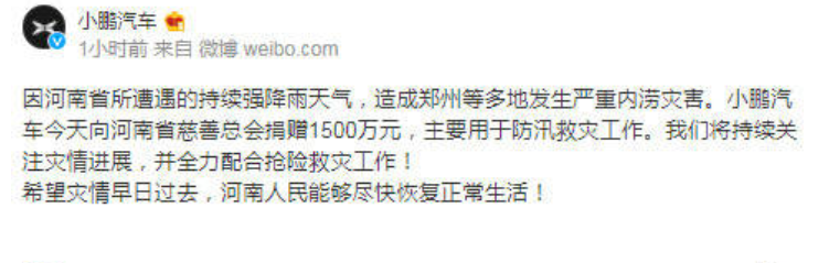 同样,小鹏汽车今天也发文表示向河南省慈善总会捐款1500万元,主要用于防汛救灾工作。并且也会持续关注灾情的发展,并且全力配合抢险救灾的工作,希望灾情早日过去,河南人民能够尽快的恢复正常生活。可以说小鹏汽车和理想汽车以及蔚来汽车成为造车新势力中的三大巨头,成为国产造车新势力的领路人。不得不说小鹏汽车不仅在销量上面有着优异的成绩,同样和理想汽车一样,在关键时刻做出了自己该有的表率。