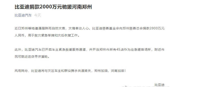 最后,作为国产新能源中的老大哥,比亚迪慈善基金会向郑州慈善总会捐款2,000万元人民币,用于救灾紧急举措和灾后的恢复工作。而且比亚迪汽车已经开启了车主紧急救援服务通道,并开放郑州市所有4S店作为应急避难场所,也就是说附近的市民可就近进店寻求援助。