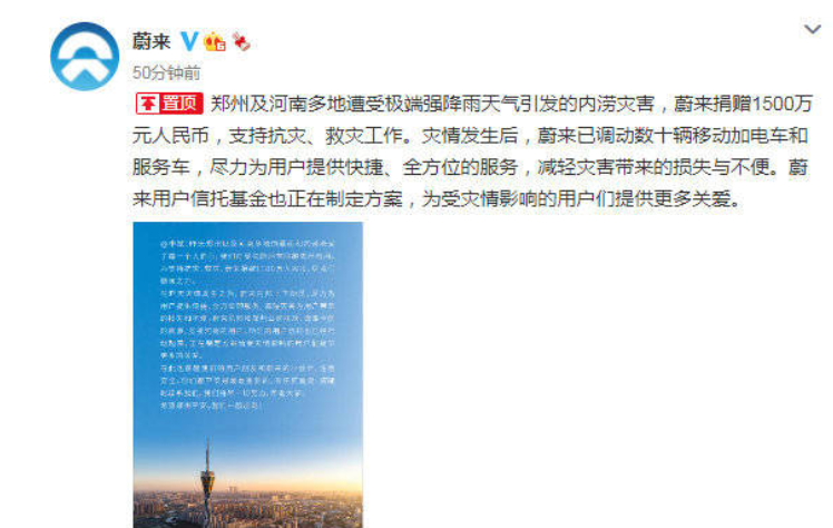 另外,一直被质疑,但一直在努力的蔚来汽车也发文表示说,因为河南郑州多地遭受极端强降雨天气所引发的内涝灾害,蔚来捐款1,500万元人民币,支持抗灾,救灾的工作。而且,蔚来不仅进行了捐款,还调动数十辆移动加电车和服务车,尽力为用户提供快捷全方位的服务,减轻灾害带来的损失和不便。不得不说,蔚来把以车为家的理念发挥得淋漓尽致,除此之外,蔚来用户信托基金也正在定制方案,为受灾影响的用户们提供更多的关爱。