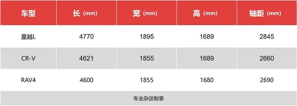 从尺寸来看,星越L长宽高分别为4770/1895/1689mm,轴距2845mm,轴距比冠道还要长。回想一下其他紧凑SUV,吉利星越L这算是突破了,看看CR-V和RAV4的尺寸,星越L盲订被秒售罄是有道理的,怪不得董事长李书福站台的时候说,这是一台“划时代、引领性的产品”。