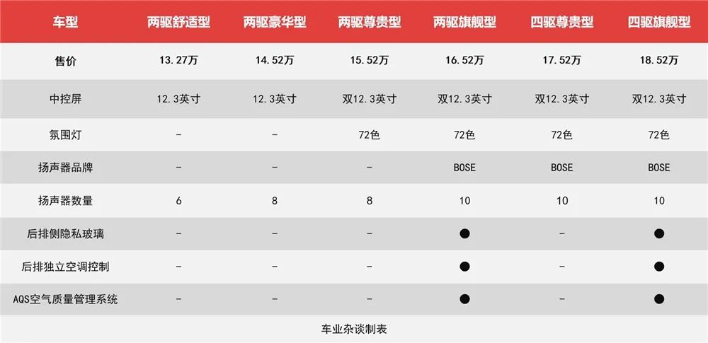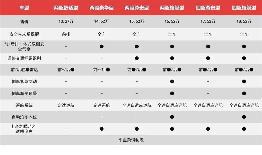 再往上走,两驱旗舰型比两驱尊贵型再贵1万,增加的主要是并线辅助、倒车车侧预警、开门预警、盲区监测、自动变道辅助、自动泊车入位、AR-HUD、手机无线充电、主动降噪、BOSE音响、后排独立空调控制、后窗隐私玻璃等等锦上添花的配置,如果预算比较充裕,也不打算入手更强劲的动力和四驱,那么两驱旗舰型就比较推荐,贵了1万,安全性更高,舒适度也更好。