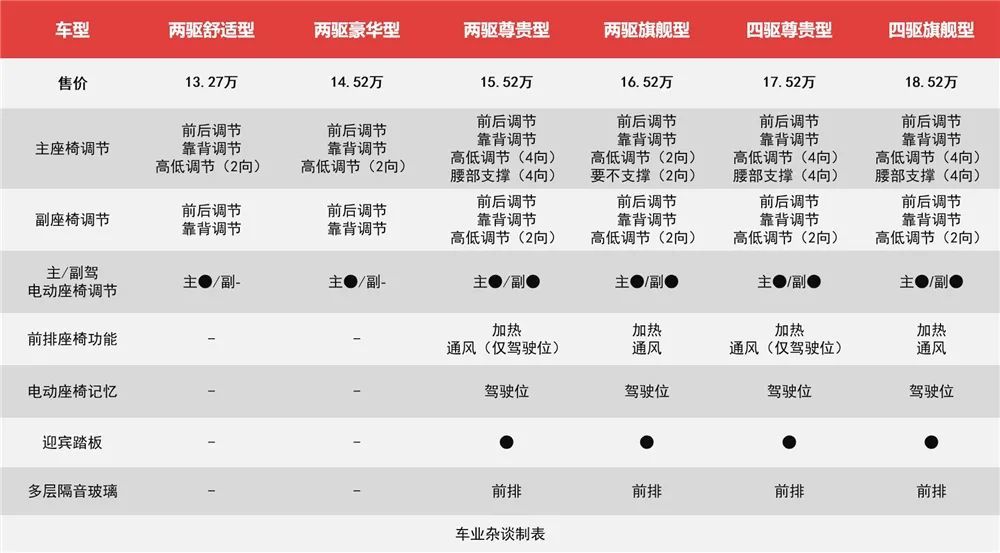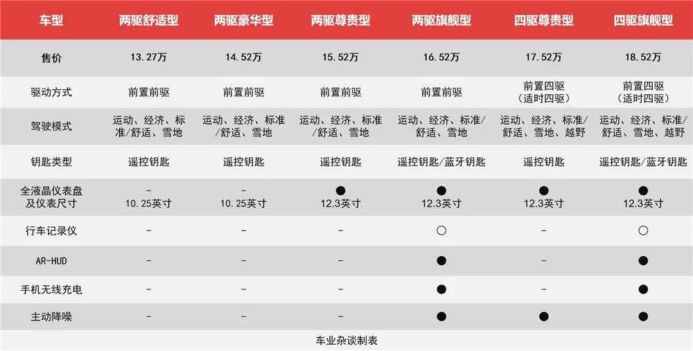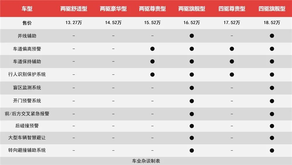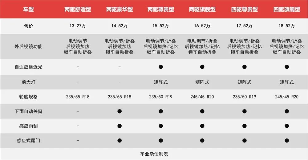 预售阶段,以为两驱豪华型是入门车型,它的基础配置基本够用了,对于手头不算宽裕的用户来说,同样是值得买的。只是这个配置的车型在液晶仪表尺寸、中控大屏和巡航系统等科技配置上有点输阵,轮胎尺寸也要小一号,始终感觉缺了点档次。而且,在主动安全方面,还是不够全面,如果可以还是更推荐两驱尊贵型。