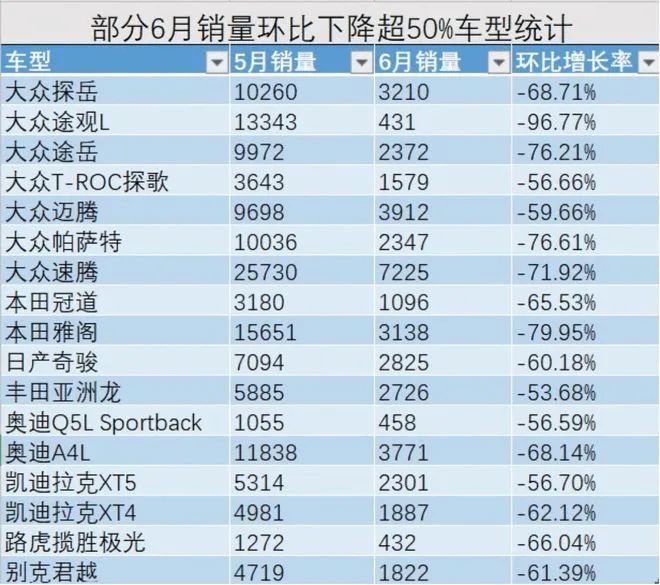 在这样的背景下,销量下跌成为包括大众、本田、奥迪等多个一线合资品牌的共同节奏,一系列“销量常青”车型也纷纷跌落神坛。据时代财经依中汽协批售数据梳理,6月超10款市场畅销车型销量环比暴跌50%以上,主要集中在德系、日系以及美系品牌。