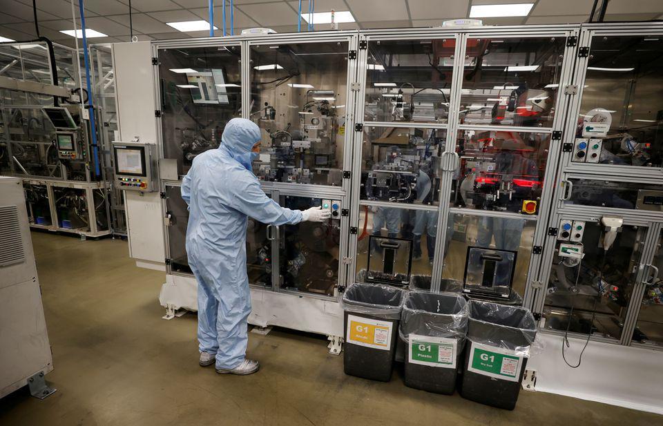 2021年7月1日,英国桑德兰日产汽车工厂内,一名身穿防护服的工人在工作(路透社 图)