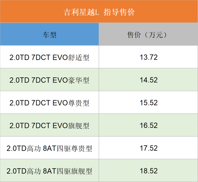 这次星越L推出了搭载两种动力总成的六款车型,其中2.0TD 7DCT EVO是搭载160kW、325N·m的中功率发动机,用2.0T排量去打对手的1.5T顶配。至于高配的2.0TD高功+8AT的车型,都配备了四驱系统,用来争夺更高价位的用户。
