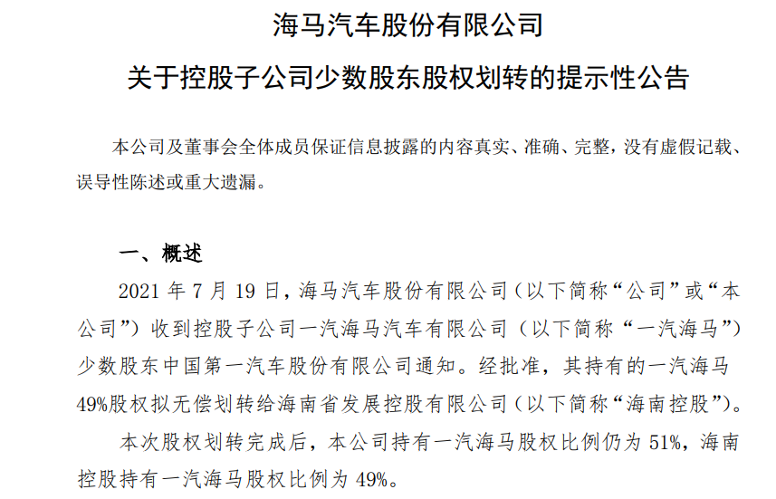 在与一汽集团“相恋”17载后,海马汽车寻求多年“独立”之路终于划下句号。7月20日,海马汽车公告,中国第一汽车股份有限公司拟将持有的公司控股子公司一汽海马49%的股权、公司参股子公司一汽海马销售50%股权,无偿划转给海南控股。