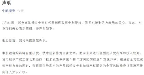 当天晚间,“中航锂电”官方微信公众号发布声明称,截至目前,公司未接到起诉状。中航锂电表示,公司始终将自主研发、技术创新作为立身之本,面向未来进行全面的研发布局和投入规划。