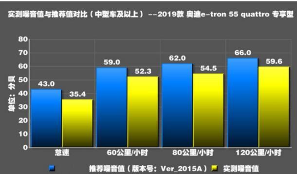 口说无凭,我们看看定量测试吧。2019年的一个非专业测试显示[5],奥迪e-tron在时速120km/h时的噪音仅为59.6分贝,比推荐值足足低了6个分贝。