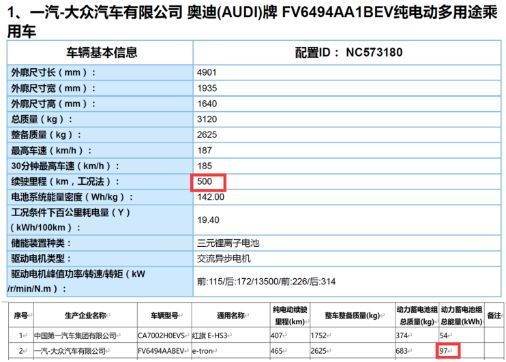 工信部的奥迪e-tron数据:续航500公里,电池容量97kWh