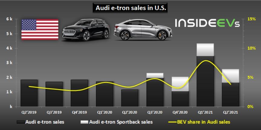 奥迪e-tron的主要销量在欧洲,但在美国的销量增长也很快:2021年上半年在美国销售了6884辆,比去年同期增长了140%[3].