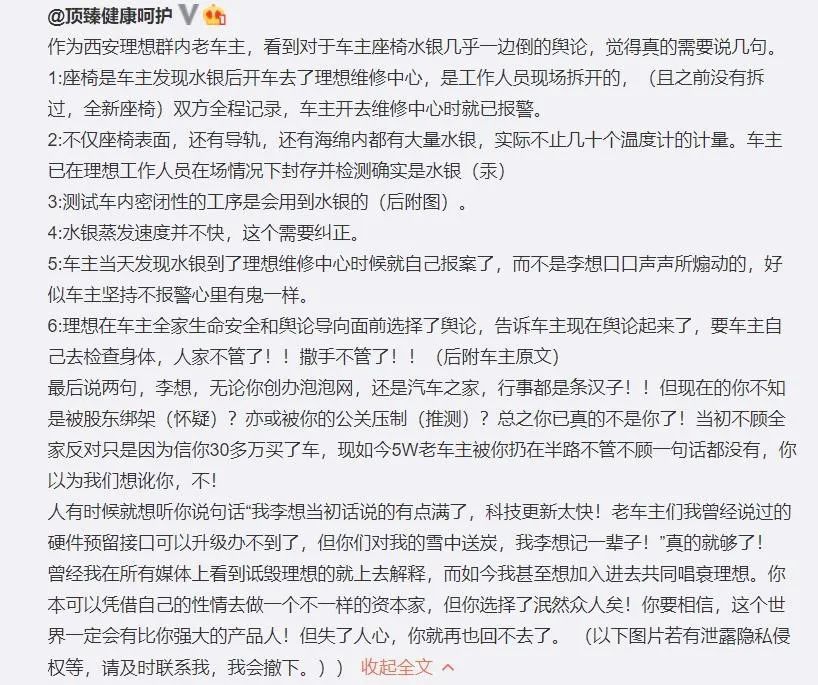 对于那些已经成为理想车主的6万多人,不需要再去过多解释车辆制造过程不需要用到水银这个事。虽然的确有一些车主去检查了,但目前为止,没有出现类似西安车主的情况。