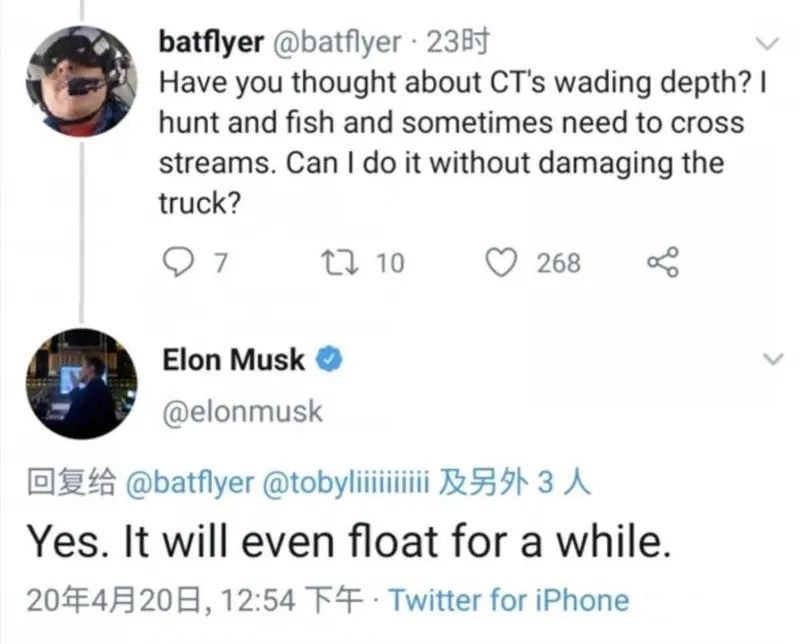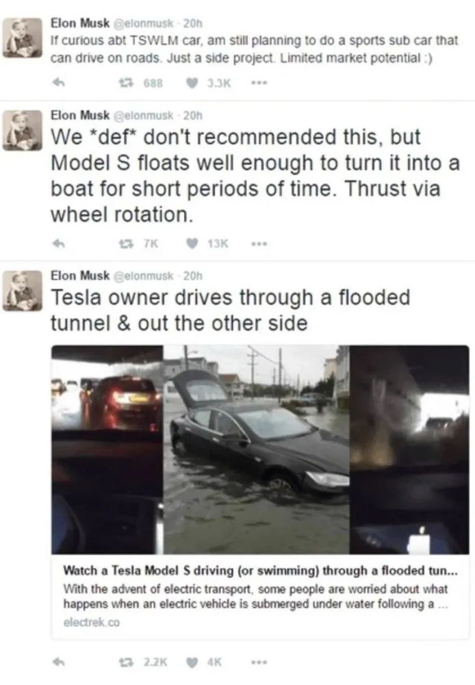 特斯拉CEO马斯克此前在社交媒体上也表过态,在一些特殊情况下,电动车确实可以短时间涉水行驶: