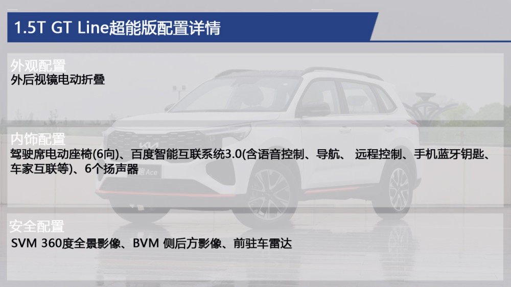 作为顶配车型,1.5T GT Line超能版拥有最齐全的配置表现,配备百度智能互联系统3.0、手机无线充电、主驾驶位6向电动调节、6个扬声器、SVM 360度全景影像、BVM 侧后方影像、前驻车雷达等,同时也搭载了性能强劲的1.5T发动机,适合预算充足的消费者。