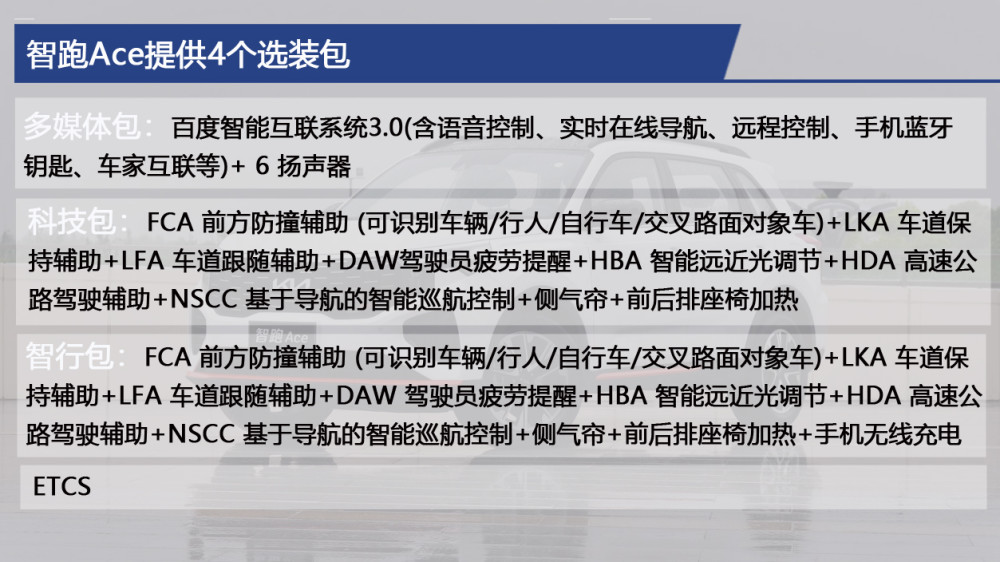 在进行配置解析前,我们先为大家介绍一下智跑Ace提供的4个选装包,如上图所示,多媒体包主要是百度智能互联系统3.0,支持2.0L挑战版和1.5T GT Line聚变版进行选装;科技包主要包含多项驾驶辅助系统、侧气帘和前后排座椅加热,支持1.5T GT Line超能版进行选装;智行包在科技包的基础上增加一项手机无线充电,支持2.0L精彩版进行选装;ETCS支持所有车型进行选装。