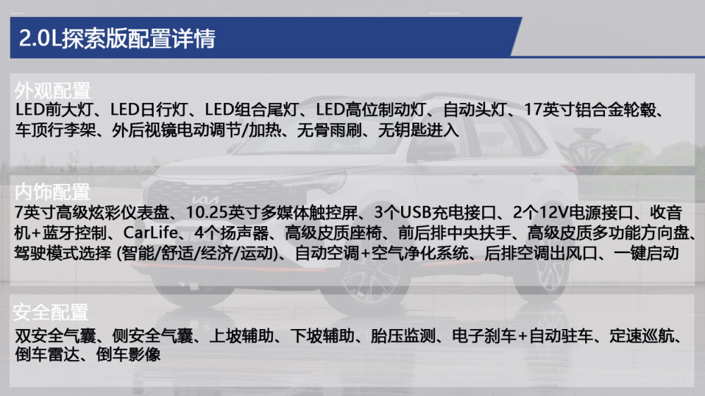 2.0L探索版虽然是入门版车型,但像LED大灯、自动头灯、外后视镜电动调节/加热、7英寸炫彩仪表、10.25英寸中控屏、自动空调、空气净化系统、后排出风口、无钥匙进入/启动等日常行车经常能用上的配置都出现在这款车上。在消费者关心的安全方面,配备定速巡航、倒车雷达、倒车影像、胎压监测、电子刹车+自动驻车等,也没有让我们失望,总的来说实用性还是不错的。