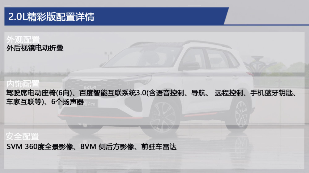 在智跑Ace推出的5款车型中,我们重点推荐2.0L精彩版车型,这款车也是2.0L车型的顶配版。配备10.25英寸多媒体触控屏,搭载百度智能互联系统3.0,支持语音控制、导航、 远程控制、手机蓝牙钥匙、车家互联等,可玩性较高。配备驾驶席电动座椅6向调节、自动空调、空气净化系统、后座出风口等,很好地兼顾了前后排乘客的乘坐舒适性。配备SVM 360度全景影像、BVM 侧后方影像、前后驻车雷达、电子刹车+自动驻车、定速巡航、胎压监测等,有效保障了用户的行车安全。2.0L精彩版的配置已经非常完善,并且价格控制在15万内,性价比高,值得重点推荐。
