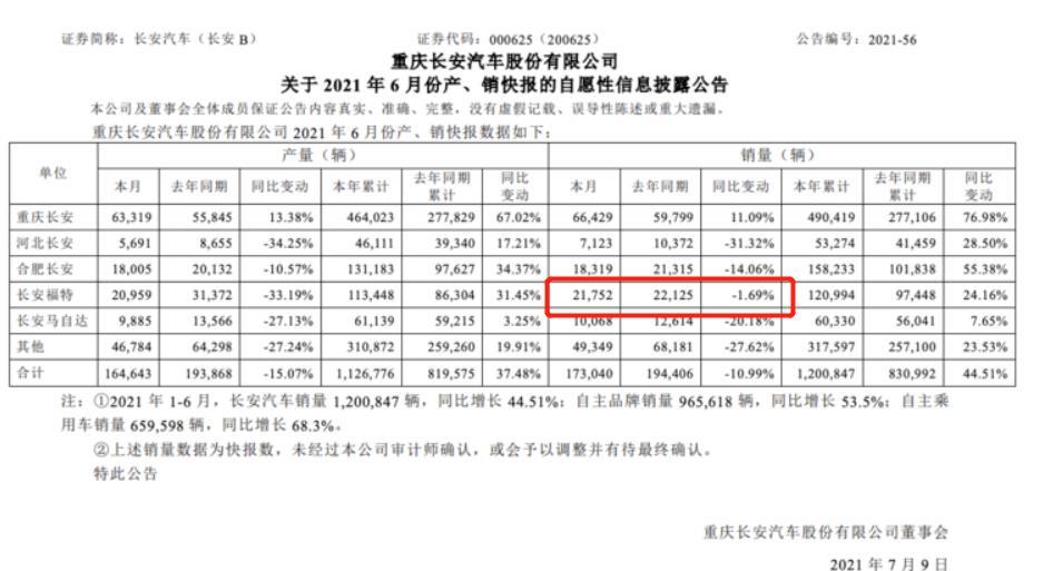 销量数据显示,今年6月份长安福特累计销量21752辆,同比再跌1.69%,其1-6月份累计销量为120994辆,同比上涨24.16%,尽管上半年销量有所回暖,但这却是建立在2020年疫情严峻,车企销量普遍下滑的大背景下。