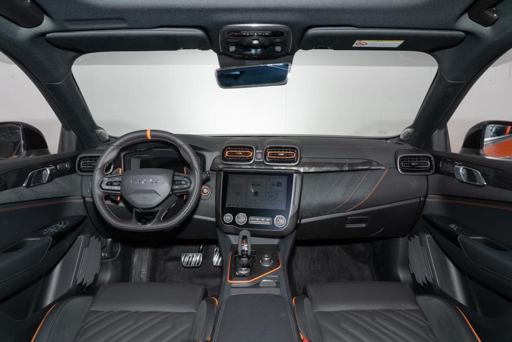 02与02HB都采用了领克家族式内饰设计,以驾驶员为中心主导,所以我们能看到略偏向驾驶员的中控屏幕,运动化座椅!二者之间最大的区别就是02HB的内饰采用了来自03+上的进口翻毛皮(Alcantara),不过为了不抢了大哥的风头,02HB上翻毛皮的比例非常低,只有电子档杆、仪表台、门边等细节部分才得以使用,如座椅等03+上采用翻毛皮的位置都被替换成了打孔皮革,这样的设计也导致了02HB没有了02那么丰富的内饰配色选择,只有纯黑色+橘色缝线。