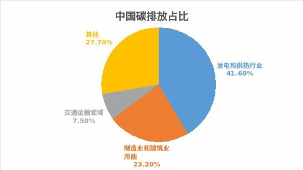 以中国为例,根据世界资源研究所(简称“WRI”)统计数据,中国的碳排放41.6%由发电和供热行业贡献,23.2%来自制造业和建筑业用能,7.5%来自交通运输领域。