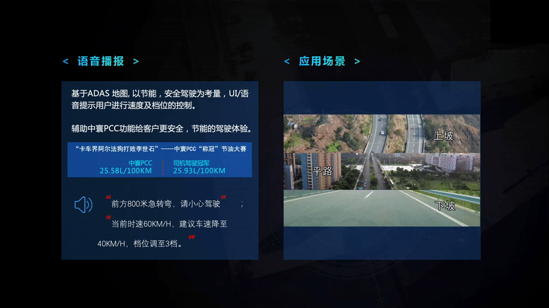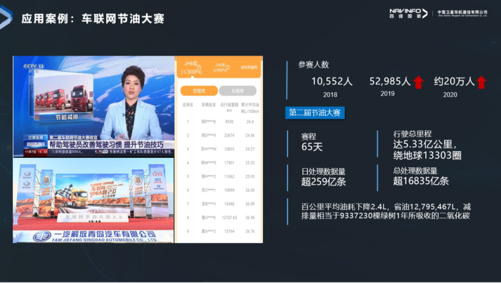 针对商用车油耗及碳排放问题,四维图新旗下中寰卫星所研发的“预见性巡航控制系统”PCC(Predictive Cruiser Control)产品,通过四维图新ADAS地图数据辅助驾驶和中寰货车通控车算法,有效帮助商用车起到舒适、节油。经测试可平均节约油耗4-8%。以2019年“解放行车联网节油大赛”为例,参赛车辆比赛总里程高达5.33亿公里,可绕地球13303圈。百公里平均油耗下降2.4L,省油12,795,467L,减排量相当于9337230棵绿树1年所吸收的二氧化碳。中寰PCC节能减排的能力,也受到了央视的关注。