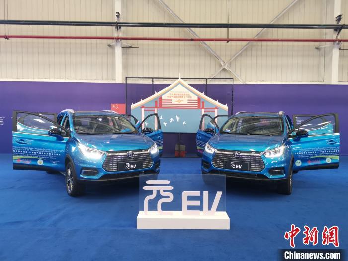 援助的8辆元EV纯电动乘用车展示。 付敬懿 摄
