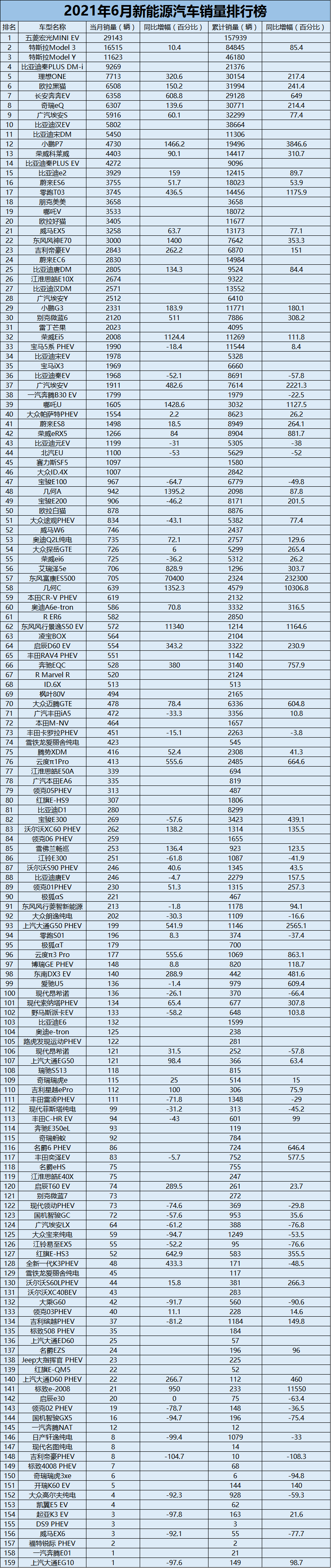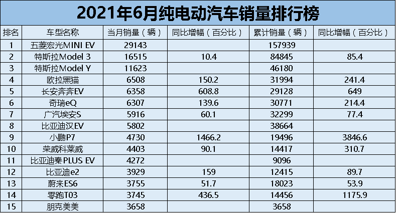 附:2021年上半年中国新能源乘用车销量榜